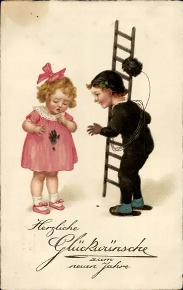 Ak Glückwunsch Neujahr, Schornsteinfeger, Leiter, Handabdruck