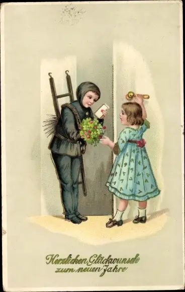 Ak Glückwunsch Neujahr, Schornsteinfeger, Mädchen, Blumen