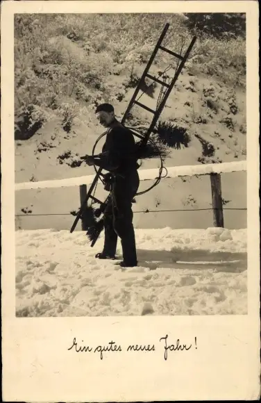 Ak Glückwunsch Neujahr, Schornsteinfeger im Schnee