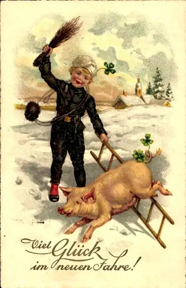 Ak Glückwunsch Neujahr, Schornsteinfeger mit Glücksschwein, Kleeblätter