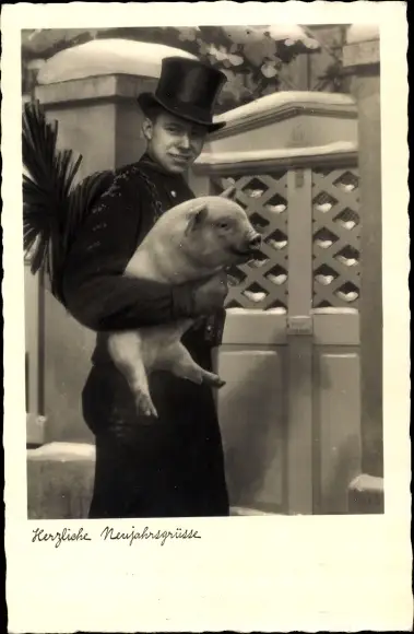 Ak Glückwunsch Neujahr, Schornsteinfeger mit Schwein
