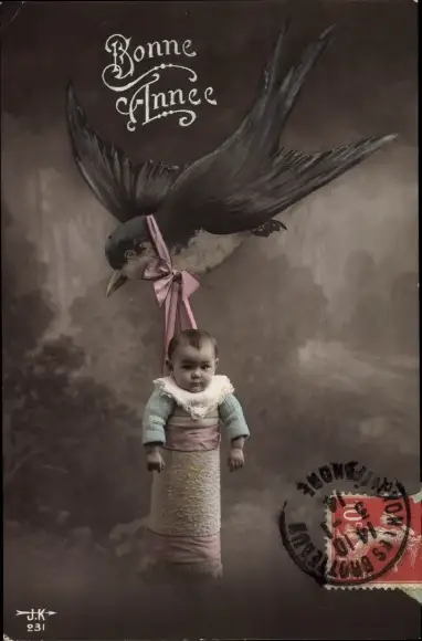 Ak Glückwunsch Neujahr, Schwalbe trägt ein Baby