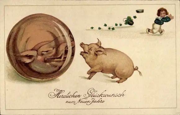 Ak Glückwunsch Neujahr, Schwein, Glaskugel, Kind