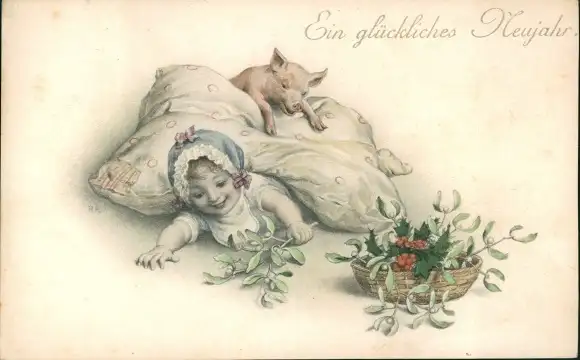 Ak Glückwunsch Neujahr, Schwein, Mistelzweige, Stechpalme, Kissen, Mädchen