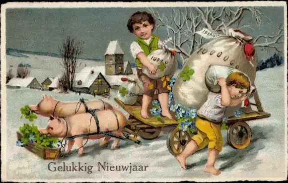 Ak Glückwunsch Neujahr, Schweine, Geldsäcke, Klee