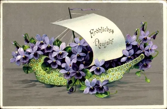 Ak Glückwunsch Neujahr, Segelboot mit Veilchen