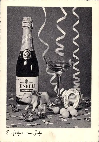 Ak Glückwunsch Neujahr, Sektflasche, Hufeisen, Schwein, Pilz, Glücksklee