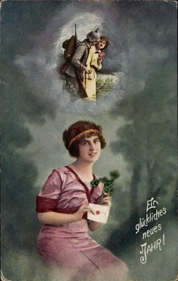Ak Glückwunsch Neujahr, Soldatenliebe, Frau mit Klee