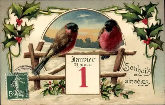 Ak Glückwunsch Neujahr, Stechpalme, Vögel, Kalenderblatt