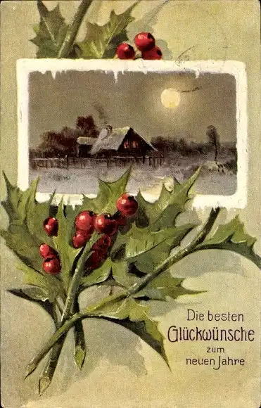 Ak Glückwunsch Neujahr, Stechpalmen, Beeren, Wohnhaus im Mondlicht