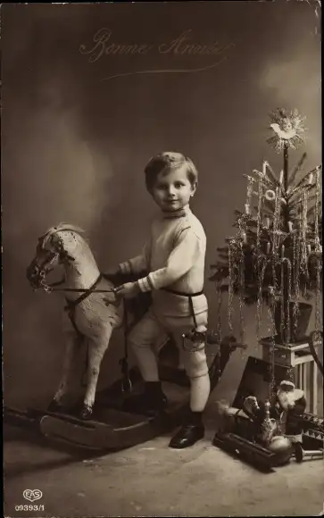 Ak Glückwunsch Neujahr, Tannenbaum, Junge, Schaukelpferd