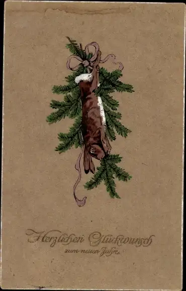 Ak Glückwunsch Neujahr, Tannenzweig mit erlegtem Hasen