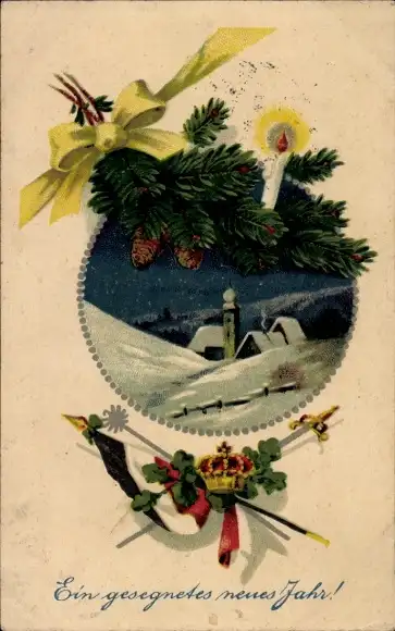 Ak Glückwunsch Neujahr, Tannenzweige, Kerze, Fahnen