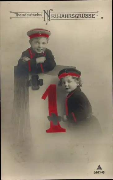 Ak Glückwunsch Neujahr, Treudeutsche Neujahrsgrüße, Kinder in Uniform, Kalender
