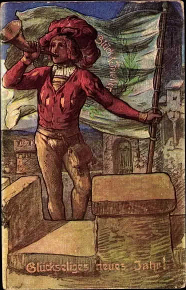 Ak Glückwunsch Neujahr, Trompeter, Fahne, Rathausturm