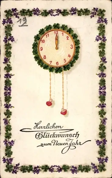 Ak Glückwunsch Neujahr, Uhr, Glücksklee, Pilze
