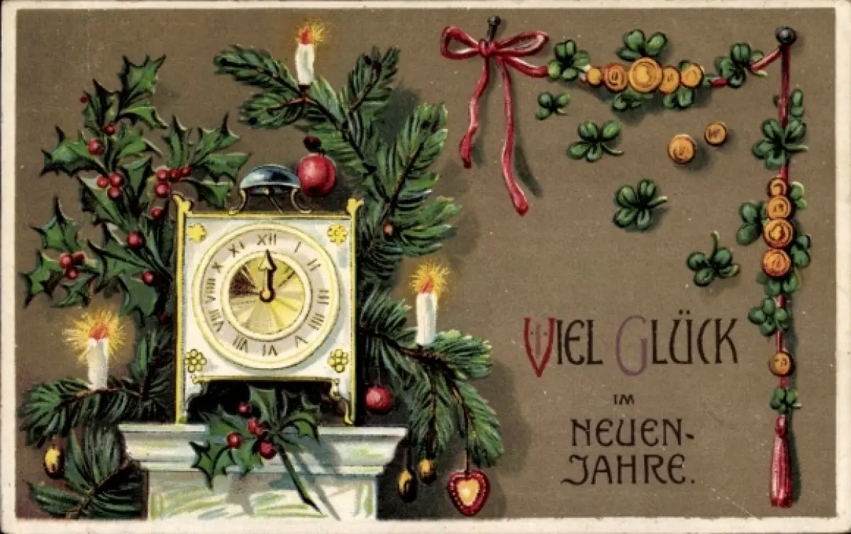 Ak Glückwunsch Neujahr, Uhr, Stechpalmenzweige, Kleeblätter