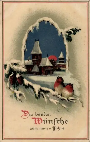 Ak Glückwunsch Neujahr, Vögel, Ortschaft im Winter