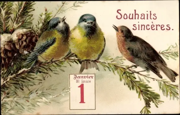Ak Glückwunsch Neujahr, Vögel, Zapfen, Kalender