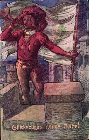 Ak Glückwunsch Neujahr, Wächter, Trompete, Fahne