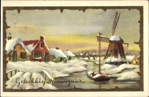 Ak Glückwunsch Neujahr, Windmühle, Winterszene, Fluss, Ruderboot