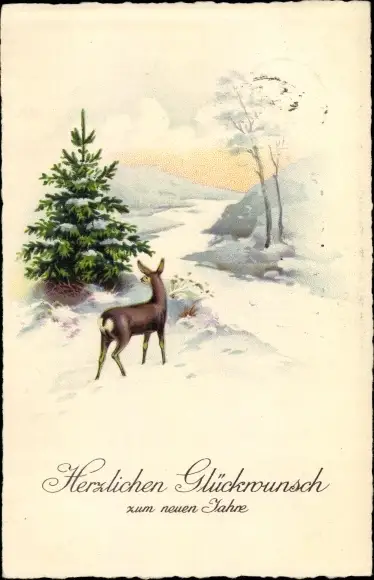 Ak Glückwunsch Neujahr, Winterlandschaft mit Reh und Tannenbaum