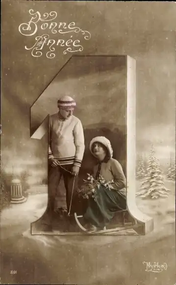 Ak Glückwunsch Neujahr, Ziffer 1, Liebespaar mit Schlitten, Winter