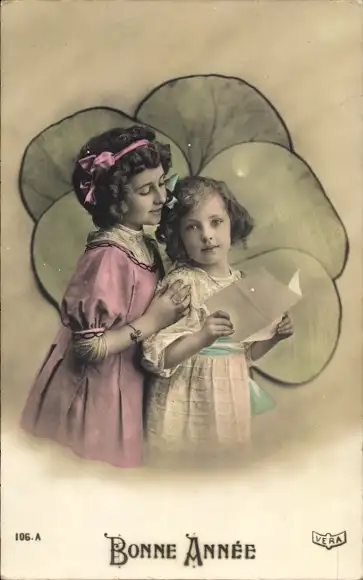 Ak Glückwunsch Neujahr, Zwei Mädchen vor einem Kleeblatt