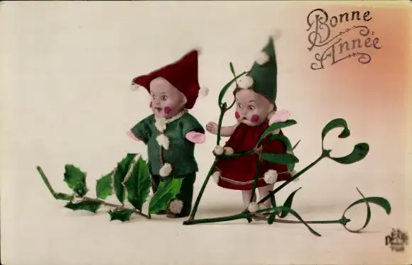Ak Glückwunsch Neujahr, Zwei Puppen und Mistelzweig
