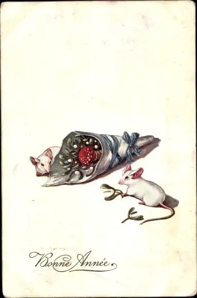 Ak Glückwunsch Neujahr, Zwei weiße Mäuse, Papiertüte mit Misteln