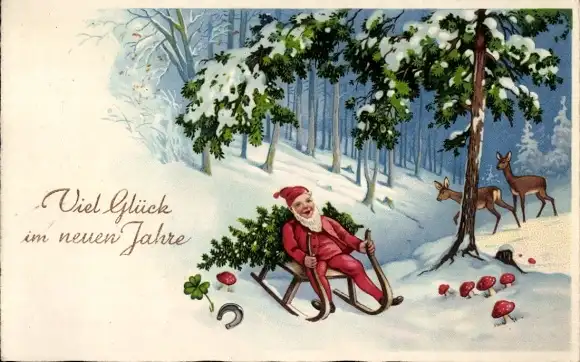 Ak Glückwunsch Neujahr, Zwerg, Schlitten, Fliegenpilz, Hufeisen, Kleeblatt, Rehe, Amag 3139