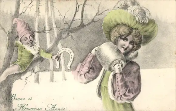 Ak Glückwunsch Neujahr, Zwerg, junge Frau, Hufeisen