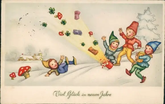 Ak Glückwunsch Neujahr, Zwerge, Geschenke, Pilze