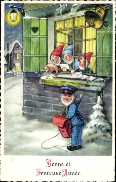 Ak Glückwunsch Neujahr, Zwerge, Schwein, Glocke, Briefträger
