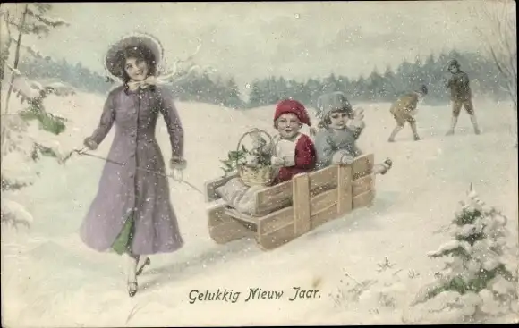 Ak Glückwunsch Neujahr, frau zieht Kinder auf einem Schlitten
