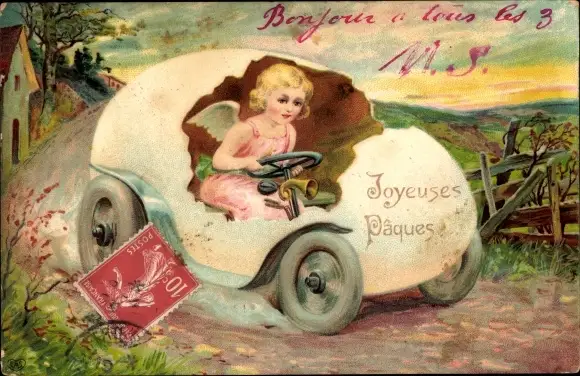 Ak Glückwunsch, Ostern, Engel fährt Auto in Form eines Ostereis