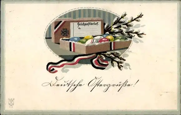 Ak Glückwunsch Ostern, Feldpostbrief, Weidenkätzchen, Ostereier