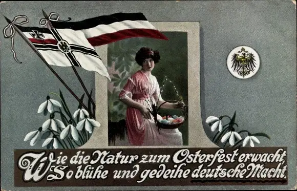 Ak Glückwunsch Ostern, Frau mit Weidenkorb, Fahnen; Schneeglöckchen