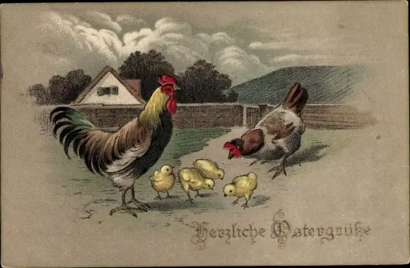 Ak Glückwunsch Ostern, Hühner-Familie, Küken