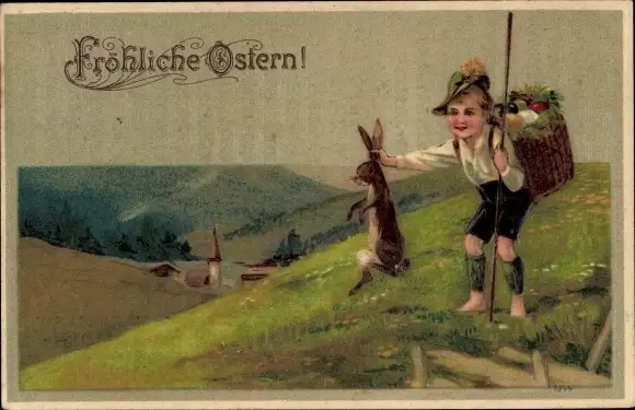 Ak Glückwunsch Ostern, Junge, Korb, Osterhase