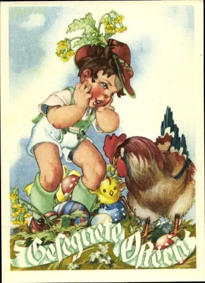 Ak Glückwunsch Ostern, Junge mit Ostereiern, Huhn, Küken