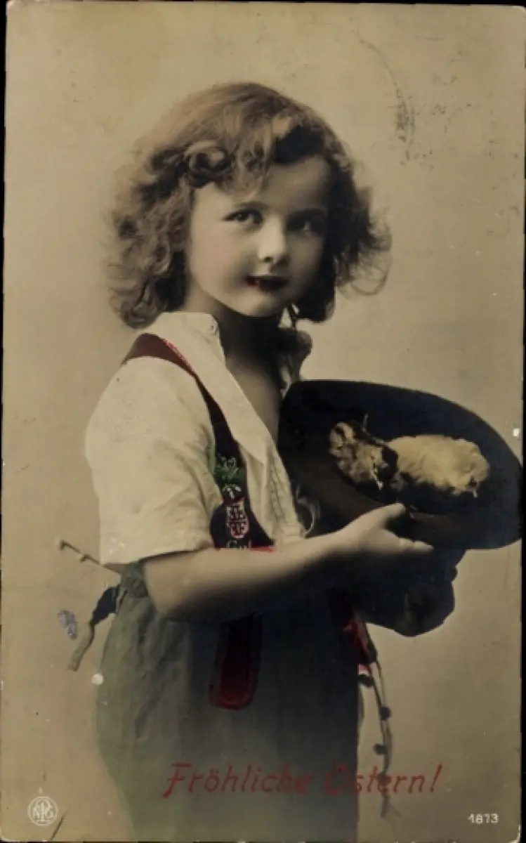 Ak Glückwunsch Ostern, Kind in Tracht, Küken im Hut