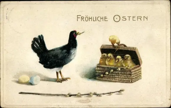 Ak Glückwunsch Ostern, Küken in einem Korb, Huhn, Weidenkätzchen, Ostereier