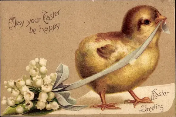 Ak Glückwunsch Ostern, Küken mit weißen Blumen