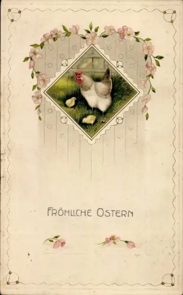 Ak Glückwunsch Ostern, Küken und Huhn auf einer Wiese