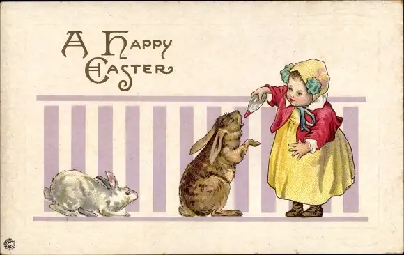 Ak Glückwunsch Ostern, Mädchen füttert Hasen