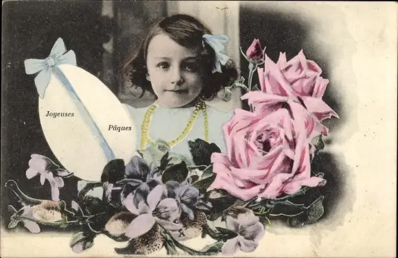 Ak Glückwunsch Ostern, Mädchen mit Osterei, Rosen, Veilchen