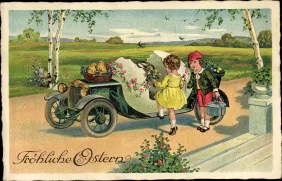 Ak Glückwunsch Ostern, Mädchen steigt in ein Automobil, Küken in einem Weidenkorb