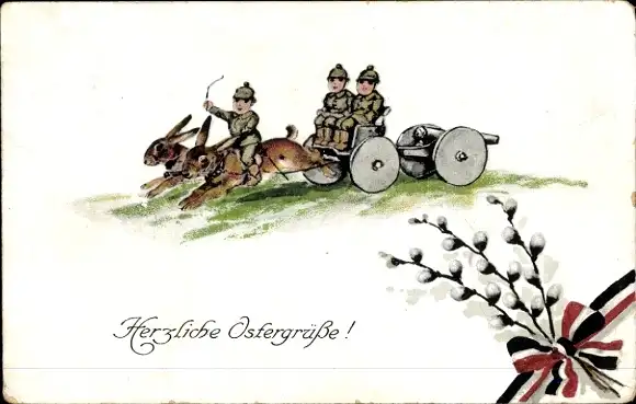 Ak Glückwunsch Ostern, Osterhasen, Kinder als Soldaten, Weidenkätzchen