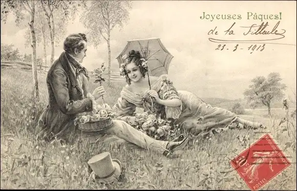 Ak Glückwunsch Ostern, Paar auf einer Wiese